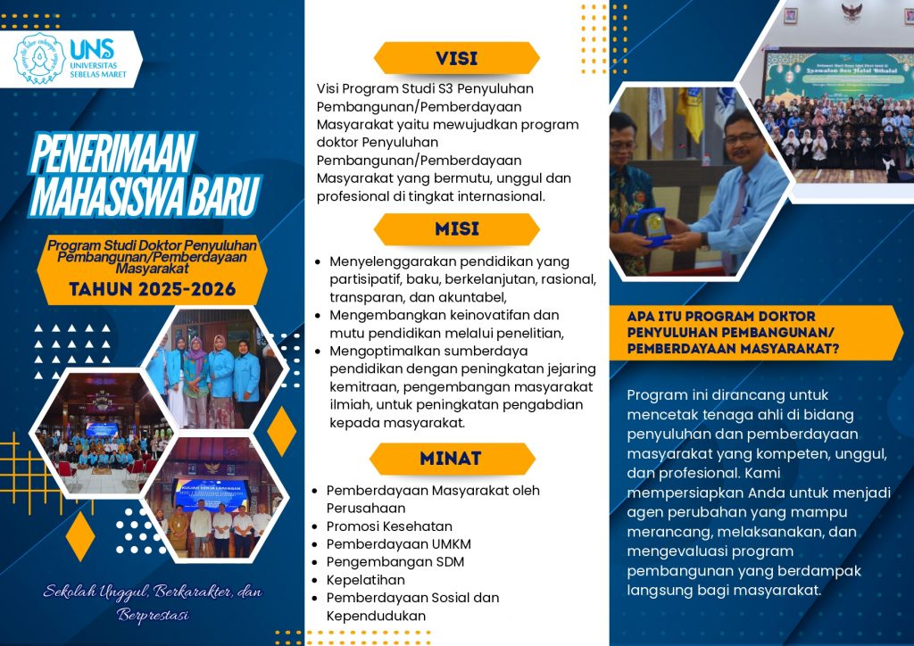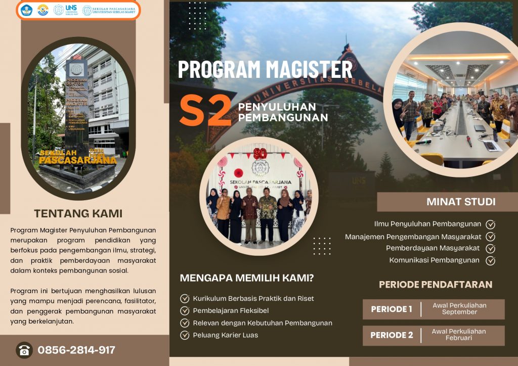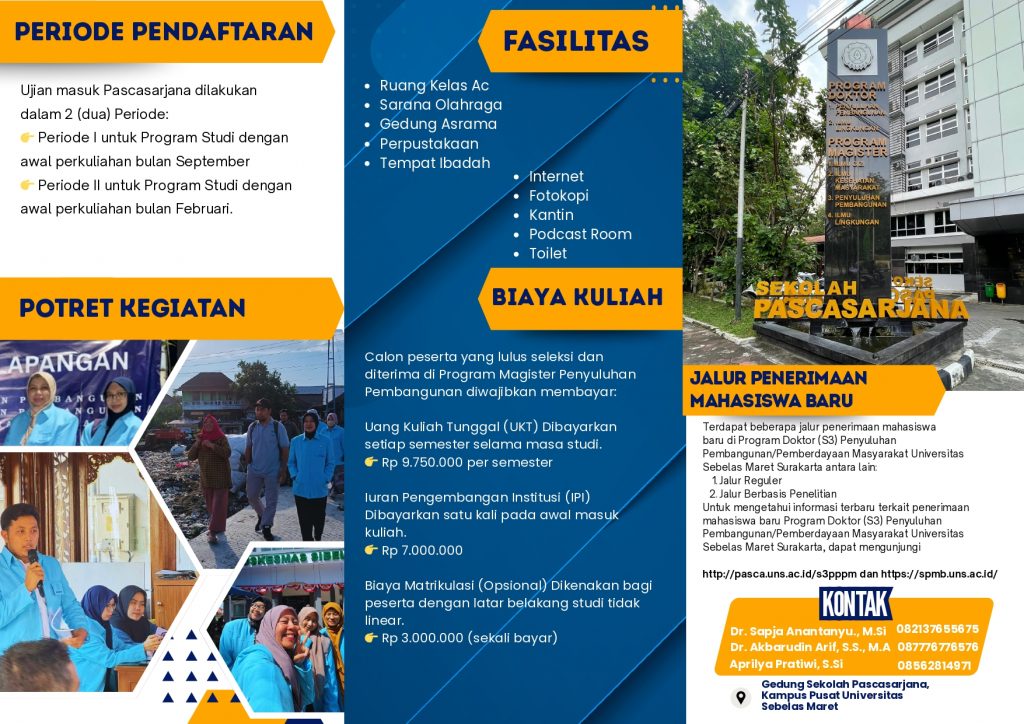 Pendaftaran mahasiswa baru dilakukan secara online melalui laman spmb.uns.ac.id, dengan periode awal perkuliahan yang dimulai pada Februari dan September setiap tahunnya. Jangan lewatkan kesempatan untuk meningkatkan kompetensi, memperluas peluang karier, dan menjadi bagian dari generasi pemimpin perubahan di bidang pembangunan masyarakat. Informasi lengkap mengenai persyaratan, biaya pendidikan, dan tahapan pendaftaran dapat diakses dengan mengklik tautan pada link di bawah ini https://pasca.uns.ac.id/ dan https://spmb.uns.ac.id/